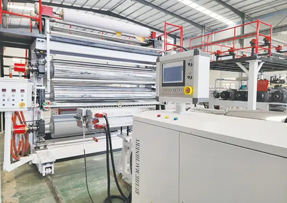 - البثق والكالبندرة: يُغذى الخليط إلى طارد لولبي مزدوج حيث يذوب بالتساوي، ثم يُدفع عبر قالب (T-die). تمر المادة المصهورة عبر بكرات الكالبندر المسطحة لضبط السماكة المطلوبة وتسوية السطح.
