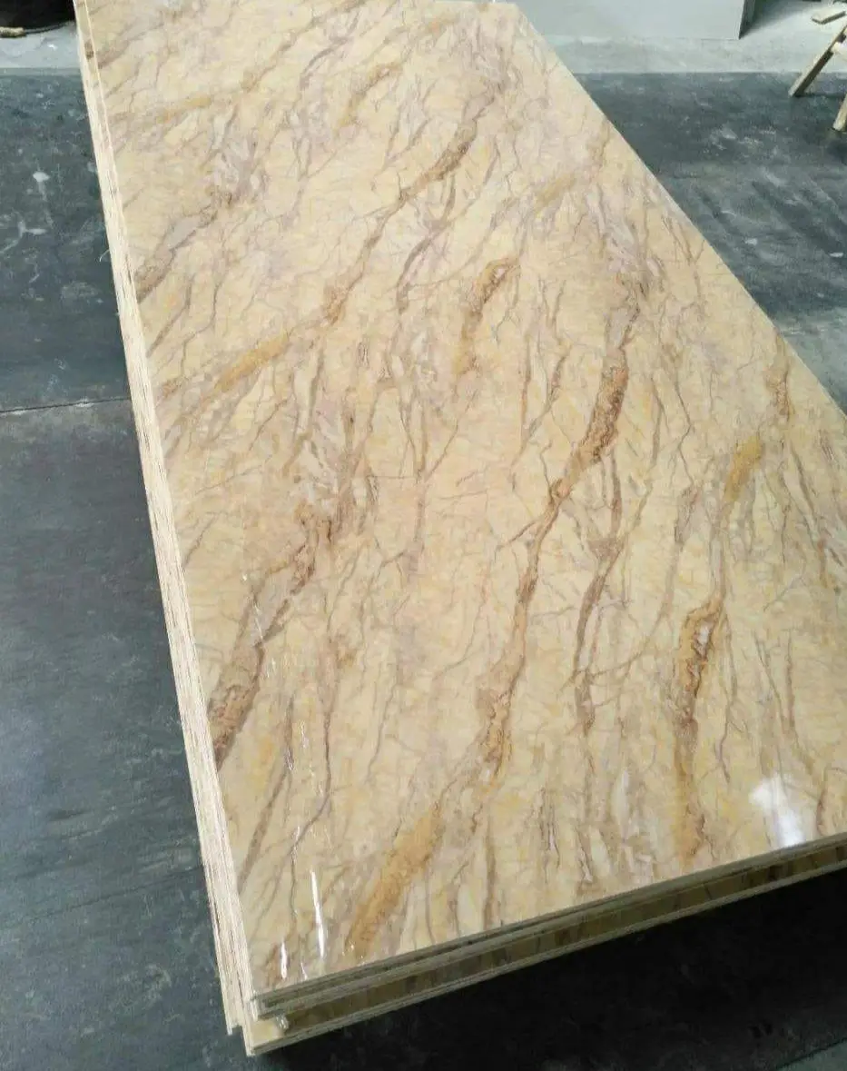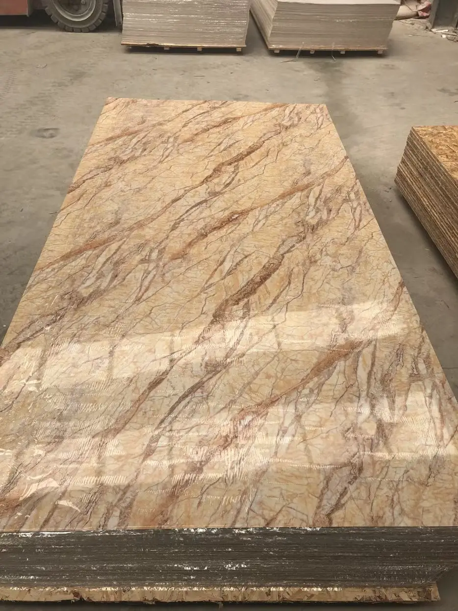 Ensuite, le film décoratif est laminé sur la feuille à l’aide d’un système d’embossage et de contrôle de température précis. Le produit final est ensuite refroidi, découpé et empilé automatiquement.