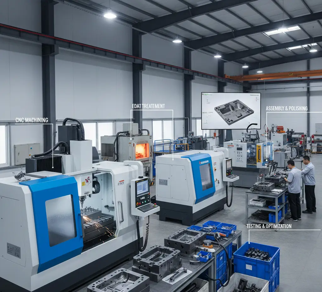 CNC milling shapes the mould cavity with extreme accuracy. This stage forms the base geometry, cooling channels, and structural features. Because CNC machines deliver micrometer-level precision, manufacturers rely on them to ensure smooth internal surfaces and consistent dimensions. Faster spindle speeds and five-axis systems now help reduce machining time and improve overall efficiency.