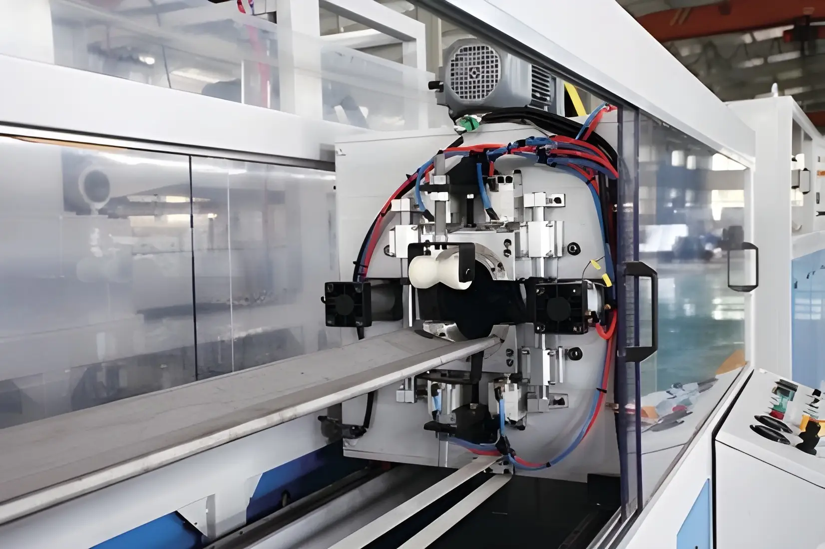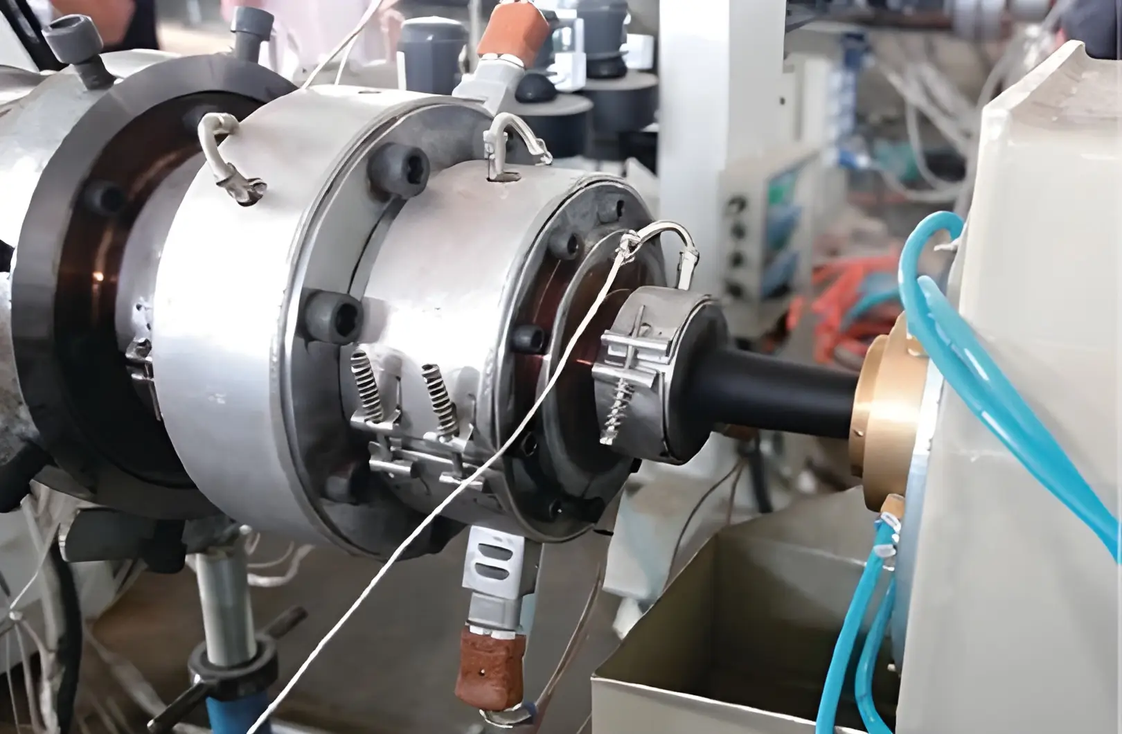 - Die Head :A precision circular die head is mounted at the extruder’s end to form the pipe’s cross-section. The die is engineered for even flow distribution and even wall thickness. Downstream of the die, a calibration insert or mandrel holds the hot pipe to exact dimensions. Proper die design prevents wall-thickness variation and surface defects.