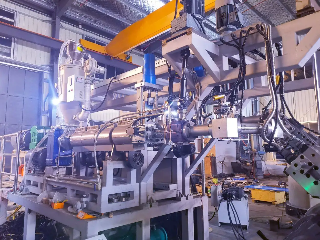 - Ekstrüder: Tek vidalı (Ø90–180 mm) veya çift vidalı (yüksek kapasite) ekstrüder. L/D ≈ 33:1–36:1; yüksek kuvvetli. Ana motor 75–185 kW (büyük hatlarda ~150–185 kW). Yakıtın homojen karıştırılması için özel vidalar. Ölçüm pompası, kalıba sabit akış sağlar.